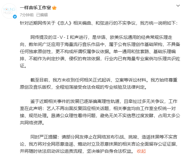 针对近期网传关于《恋人》相关编曲、和弦进行的不实争议,我方统一说明如下: