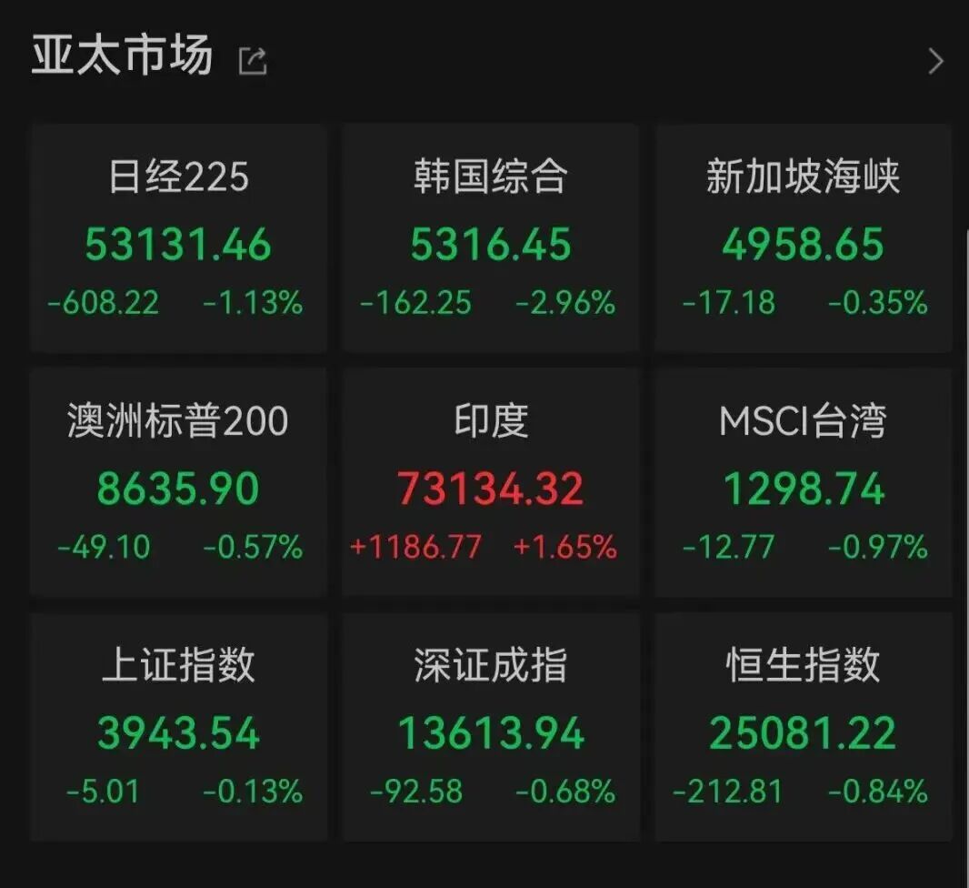 北京时间4月2日上午,美国总统特朗普发表讲话后,全球资产剧烈波动。亚太股市集体走弱。Wind数据显示,截至北京时间9:53,韩国综合指数跌2.96%,报5316.45点;日经225指数跌1.13%,报53131.46点。A股主要指数均低开。Wind数据显示,截至北京时间9:53,上证指数跌0.13%,深证成指跌0.68%。港股低开,截至北京时间9:53,恒生指数跌0.84%。