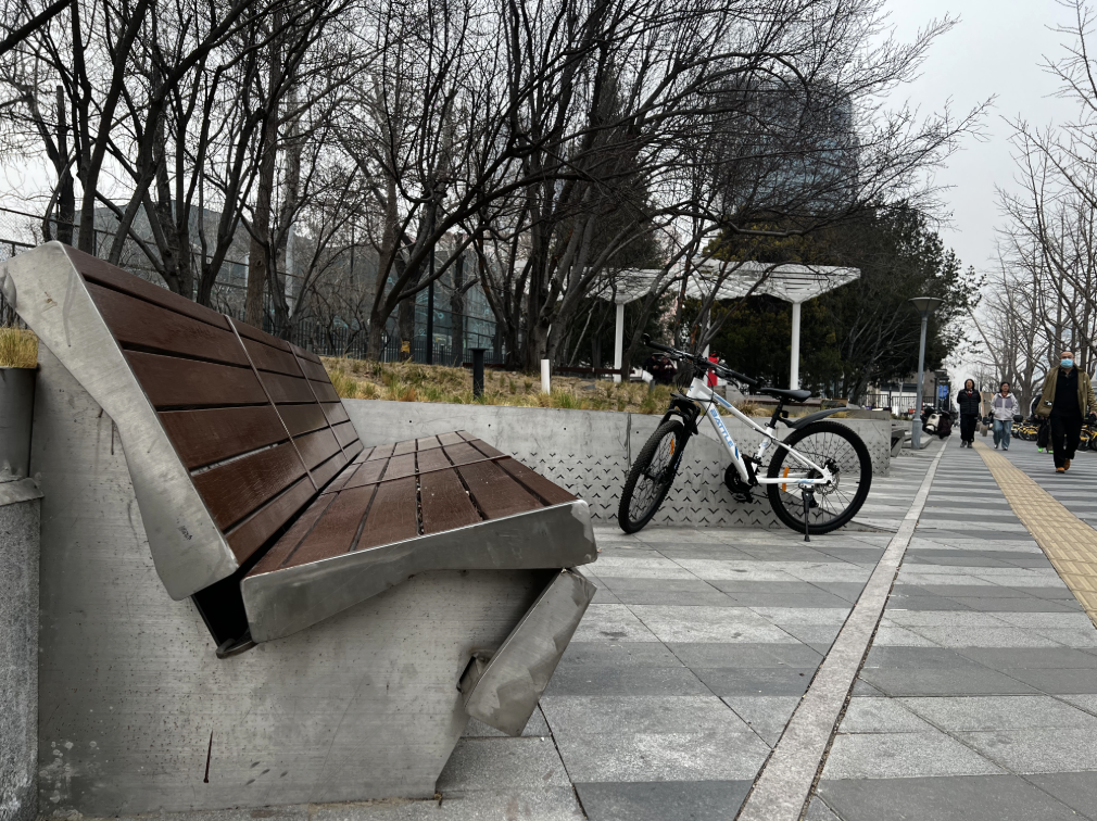 三虎桥北路路侧设置的街头座椅,路人如靠在椅背上,腿脚只能平放椅面。