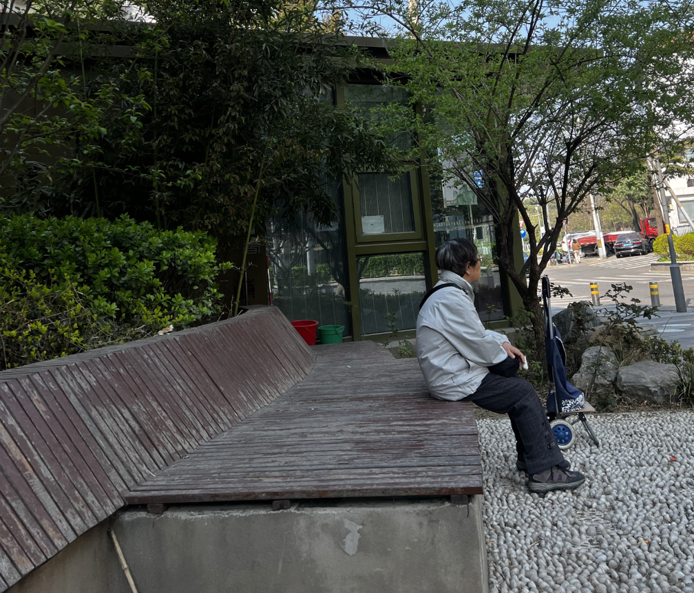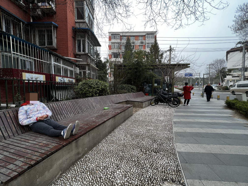 三虎桥北路,路侧座椅让老人够不着椅背。