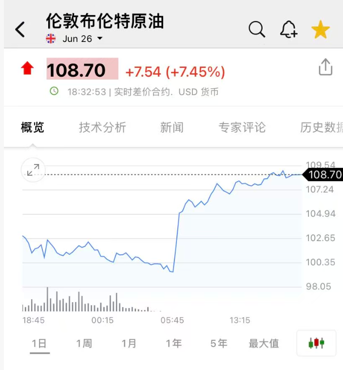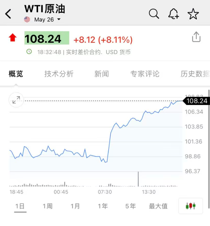 国际油价大幅拉升,美油涨8%,报108.12美元/桶;布油涨超7%,报108.7美元/桶。