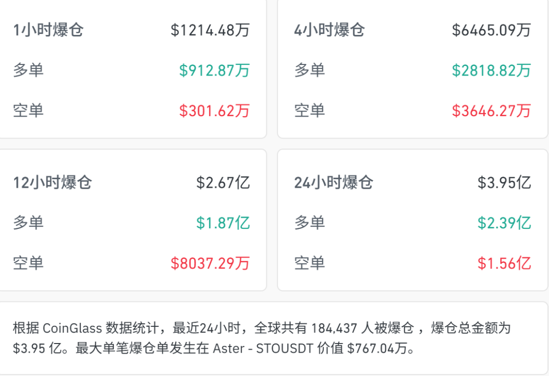 据CoinGlass数据统计,最近24小时,全球共有超18万人被爆仓,爆仓总金额为3.95亿美元。
