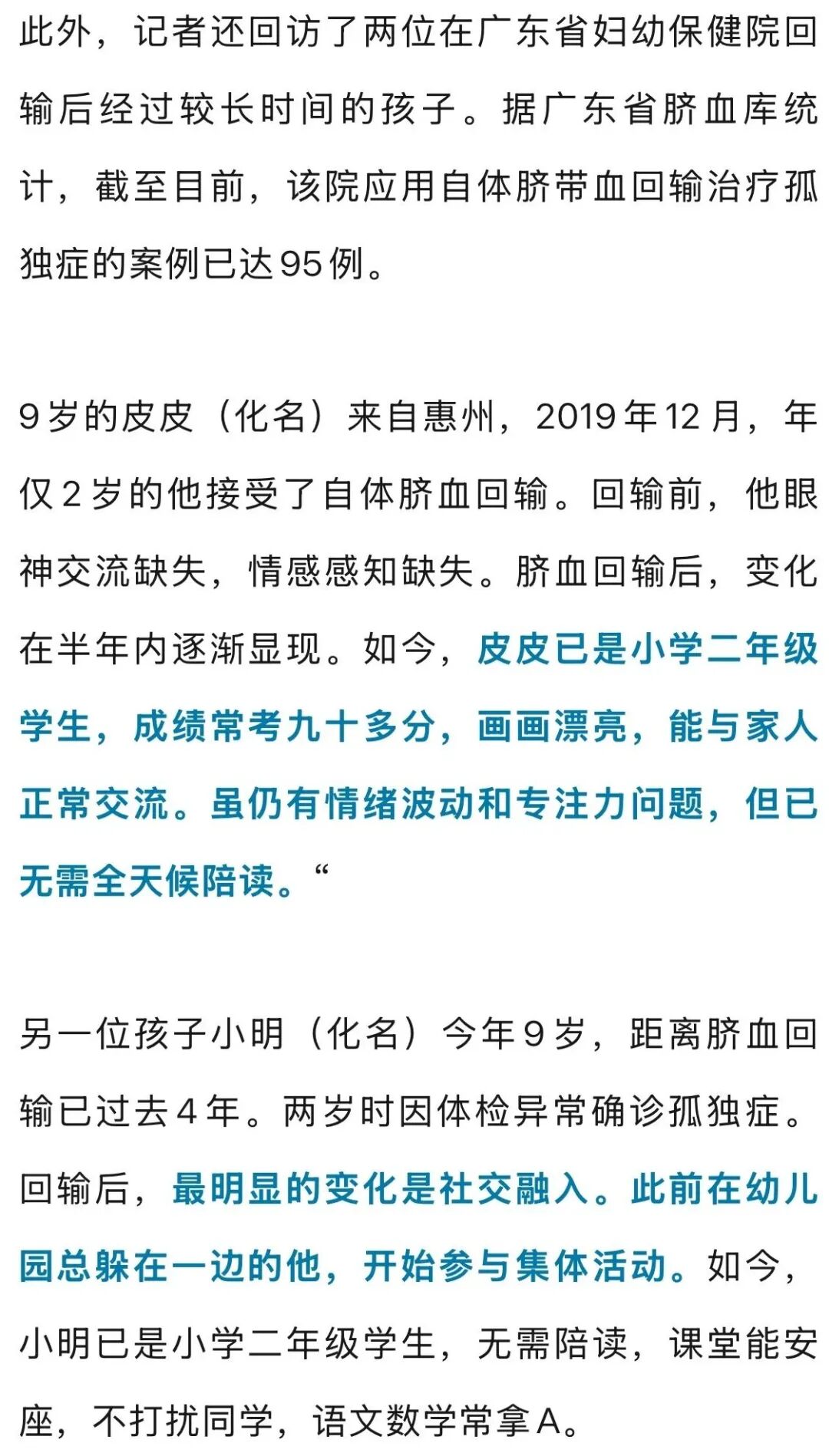 作为孤独症治疗的重要探索方向,脐带血回输已在广州积累多例临床改善案例。据广东省脐血库统计,目前该库应用自体脐带血回输治疗孤独症累计116例。专家指出,脐带血回输治疗孤独症具有广阔前景。
