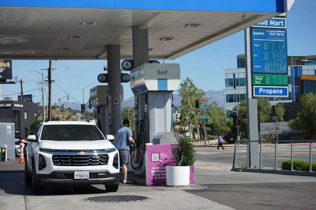 △3月17日,顾客在美国加利福尼亚州洛杉矶市中心的一家加油站给车辆加油。图据新华社