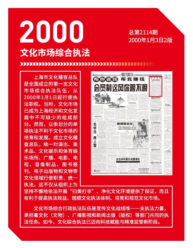 上海市文化稽查总队是全国成立的第一支文化市场综合执法队伍,从2000年1月1日起行使执法职权。当时,文化市场已成为上海经济和文化发展中不可缺少的组成部分。然而,以条划分的单项执法不利于文化市场的培育和发展。成立文化稽查总队,统一对演出、美术品、文化娱乐和体育娱乐场所、广播、电影、电视、音像制品、图书报刊、电子出版物和文物等文化领域行使职责、统一执法。这不仅从组织上为坚持不懈地依法开展“扫黄打非”、净化文化环境提供了保证,而且有利于提高执法效益、理顺文化执法体制、培育和规范文化市场。
