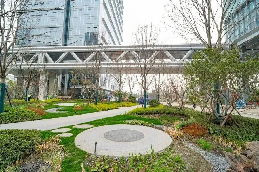 项目设计了大量绿化和雨水集中区,整个园区处处藏着“海绵”巧思。项目总工程师介绍,建筑的屋顶和地库顶板,都设计了种植屋面,内部则设计了垂直绿轴。在保证采光的同时,为办公人员提供与自然和谐统一的办公环境。