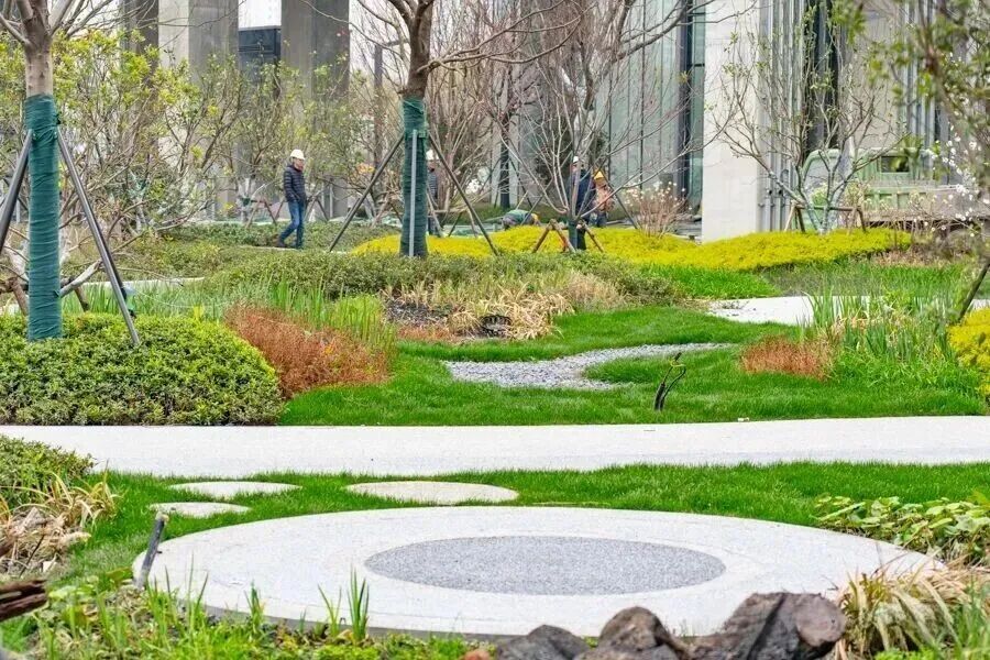 园区内还设置了3个雨水集中区和5个高渗透性软绿化区,再加上透水铺装,一方面防止雨水沉积,一方面可回收、储存雨水,让雨水可以二次利用。据测算,园区雨水储存量约1000立方米,可基本实现灌溉、清洁的“自给自足”。