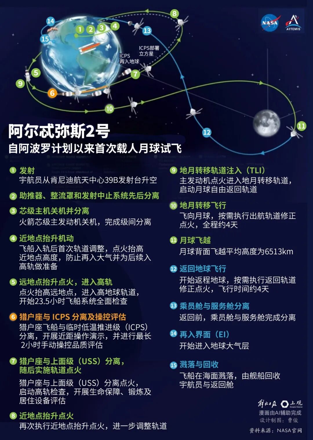 任务指令长里德·怀斯曼、驾驶员维克多·格洛弗、任务专家克里斯蒂娜·科赫,以及加拿大宇航员杰里米·汉森将飞越月球背面,经历约30-50分钟的通讯中断,随后借助月球引力弹弓效应加速返回地球。最远时,飞船距离地球约40万公里,创造了载人航天飞行距离的新纪录。