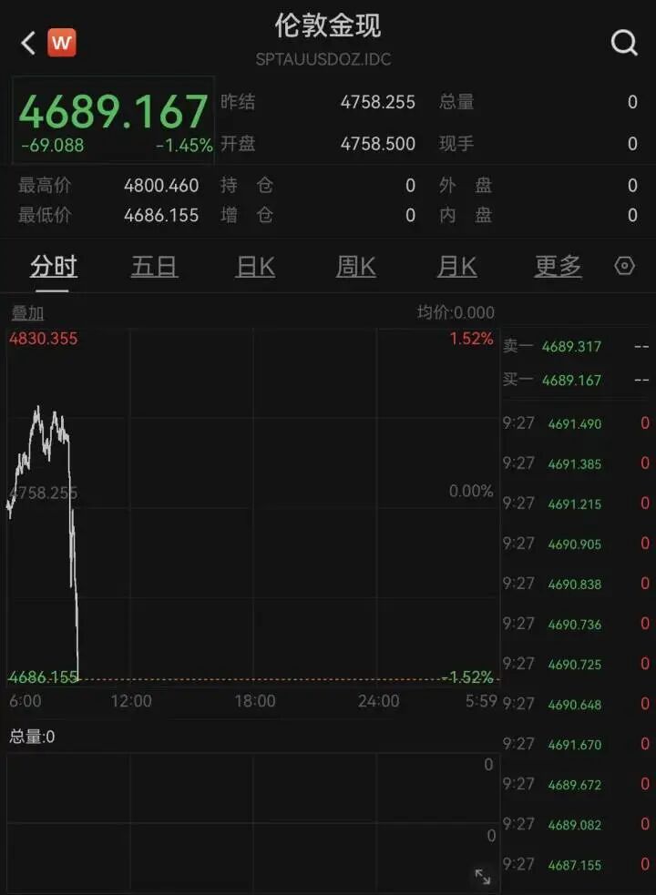 黄金应声跳水,跌破4700美元。截至上午9时26分,现货黄金报4689.167美元/盎司,日内跌幅1.45%。
