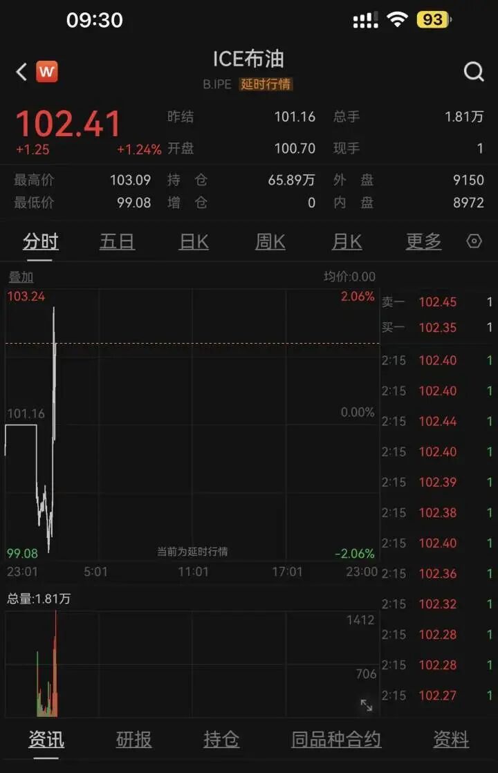 原油大涨,布油拉升至102.41美元,日内涨幅1.24%。