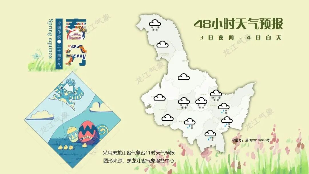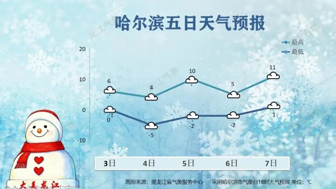 3日夜间到4日白天:大兴安岭北部、伊春南部、绥化北部、鹤岗阴有小到中雪或雨夹雪,哈尔滨、佳木斯、双鸭山、七台河、鸡西、牡丹江阴有小到中雨或雨夹雪,其他地区多云。