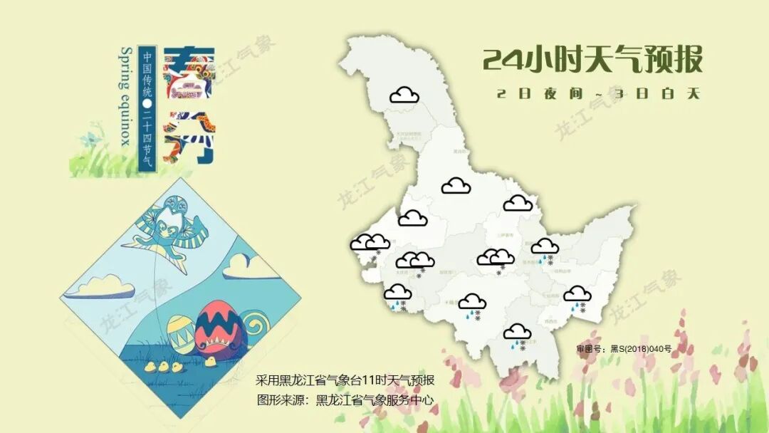 4日夜间到5日白天:大兴安岭北部、黑河南部、伊春南部、齐齐哈尔北部、绥化北部阴有小雪或雨夹雪,齐齐哈尔南部、绥化南部、哈尔滨、佳木斯、双鸭山、七台河、鸡西、牡丹江阴有小雨或雨夹雪,其他地区多云。