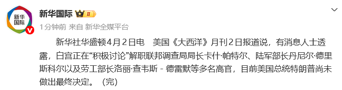 新华社华盛顿4月2日电美国《大西洋》月刊2日报道说,有消息人士透露,白宫正在“积极讨论”解职联邦调查局局长卡什·帕特尔、陆军部长丹尼尔·德里斯科尔以及劳工部长洛丽·查韦斯-德雷默等多名高官,目前美国总统特朗普尚未做出最终决定。