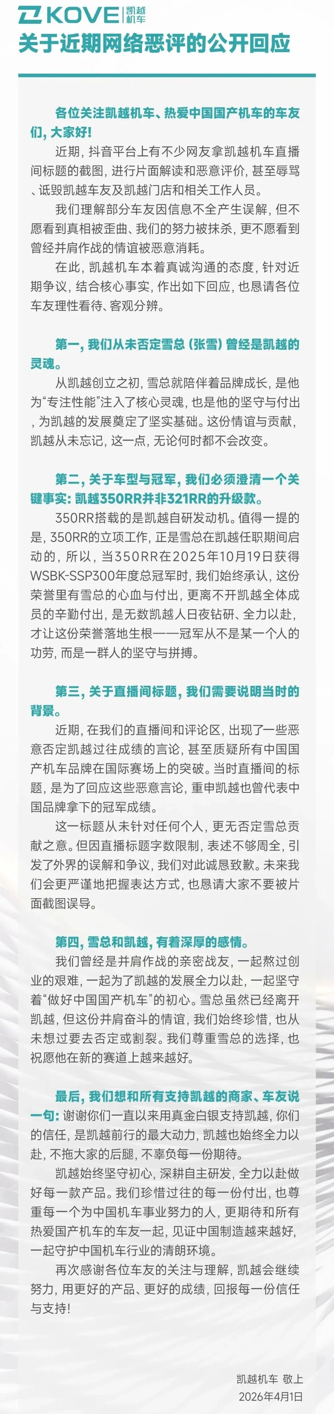 4月1日晚,凯越机车针对近期网络恶评作出公开回应,澄清从未否定张雪曾为品牌“灵魂”的贡献,肯定其早期坚守与付出,并强调彼此深厚情谊,尊重其选择。