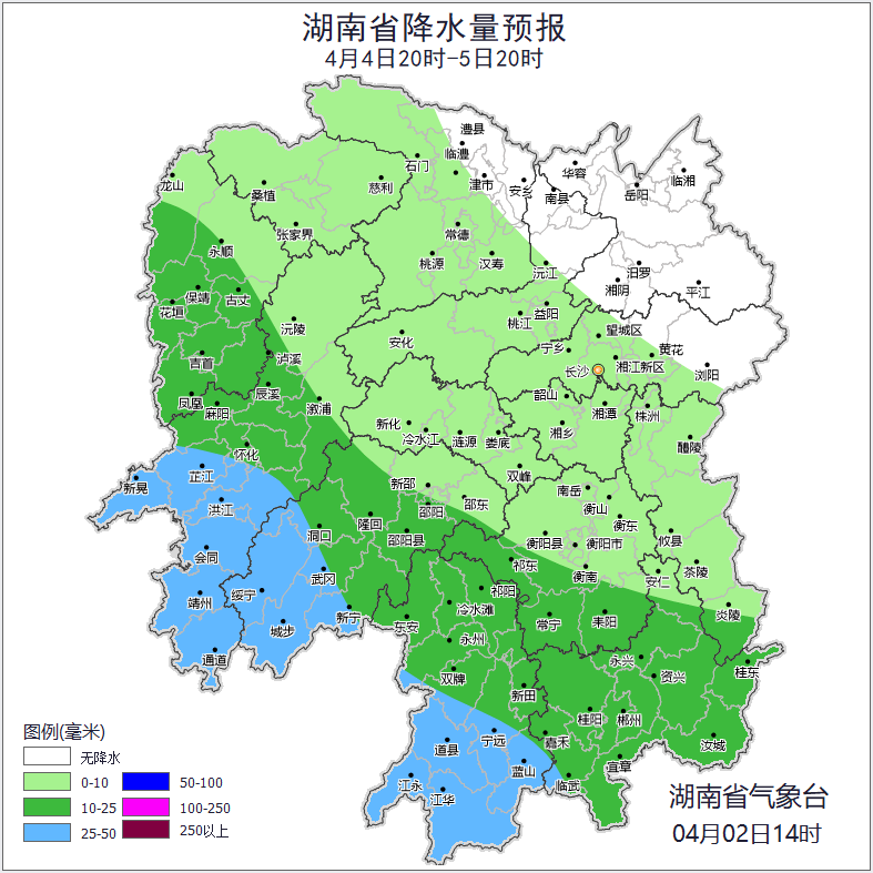 湖南省气象台4月2日16时发布暴雨黄色预警:预计2日20时至3日20时,株洲、衡阳东部和南部、邵阳西南部、郴州西南部、永州南部、怀化南部部分地区有暴雨,局地有大暴雨(100~130毫米),并伴有短时强降水(最大小时雨强30~60毫米)、雷雨大风(局地阵风8~10级)等强对流天气,请加强防范。