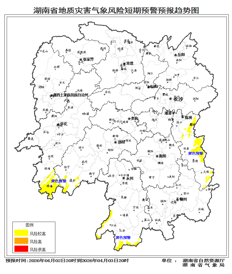 根据地质灾害成灾规律和孕灾条件,结合2026年4月2日短期气象预报情况,省自然资源厅与省气象局联合会商得出如下结论:自4月2日20:00至3日20:00,受降雨影响,湘东、湘南、湘西南的株洲、邵阳、永州、怀化等市州山地丘陵区发生突发性地质灾害风险较高黄色预警。