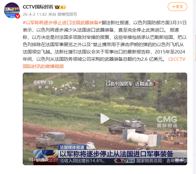 据法新社报道,以色列国防部方面3月31日表示,以色列将逐步减少从法国进口武器装备,直至完全停止此类进口。