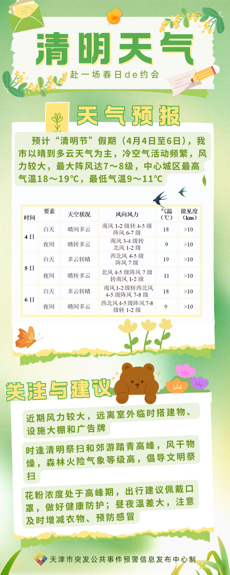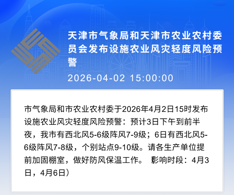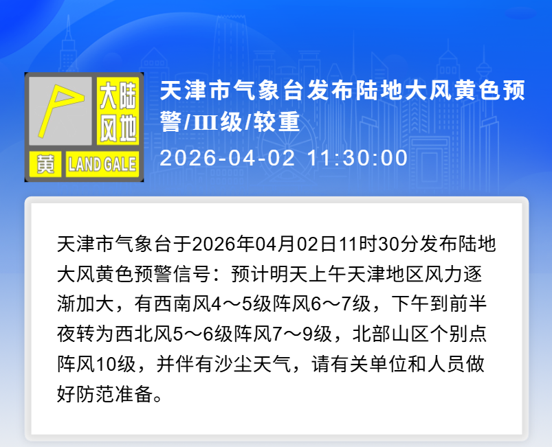 市森防办提醒:据市气象部门预报,预计明天上午天津地区风力逐渐加大,有西南风4~5级阵风6~7级,下午到前半夜转为西北风5~6级阵风7~9级,北部山区个别点阵风10级。清明假期期间,我市仍将连续出现大风天气,尤其北部山区阵风风力较大,叠加正值清明祭祀高峰,踏青春游人数大幅增加,火源管控难度持续加大,森林火险形势严峻复杂。请广大市民群众要提高森林防火意识,自觉遵守森林防火规定,文明祭扫,禁止野外用火,发现森林火情及时报警。(市应急管理事务中心)