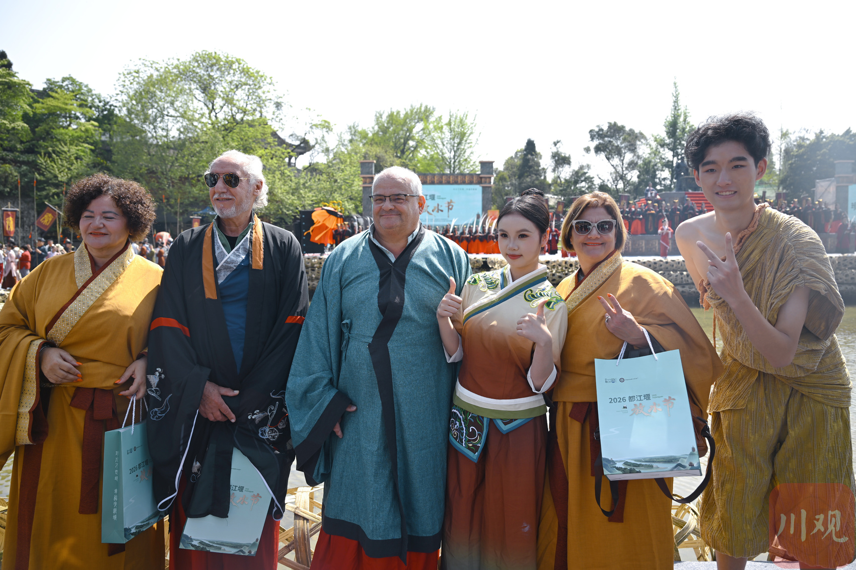 都江堰放水大典现场,外国游客身着汉服前来体验。