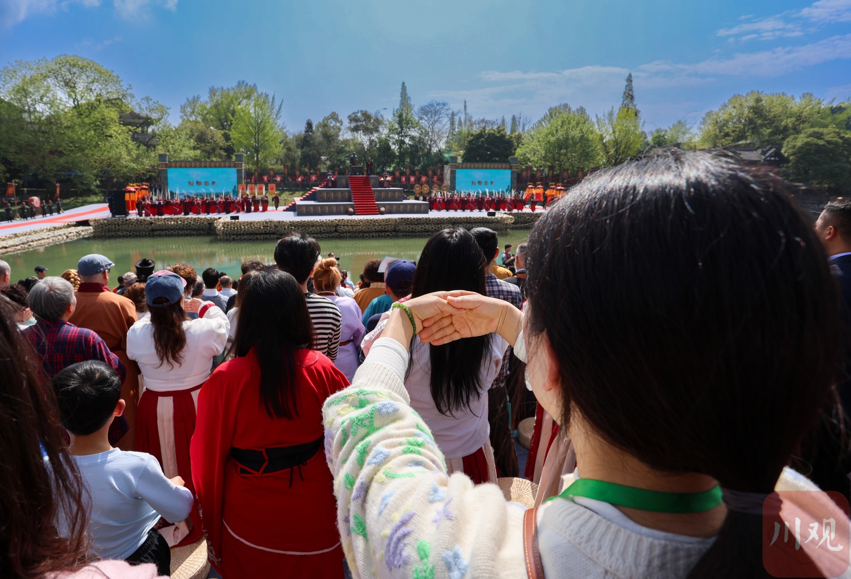 都江堰放水大典现场,观看大典的游客正在模仿古礼手势。