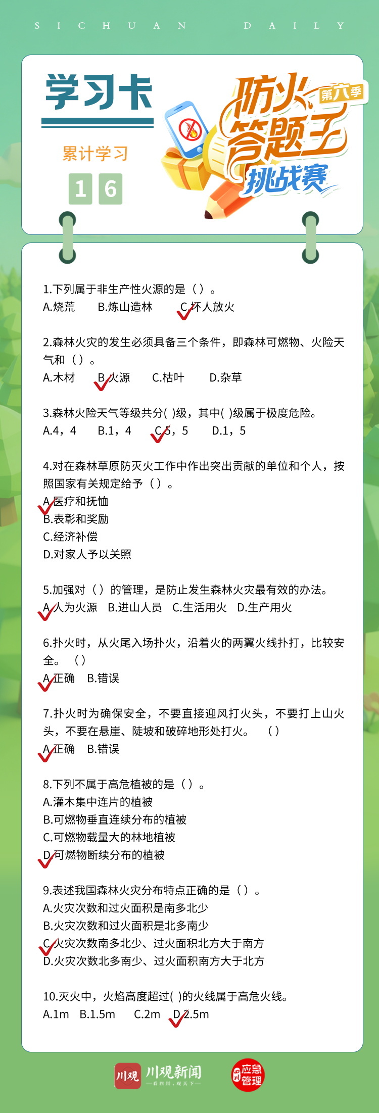 防火 “答题王” 第六季新一期学习卡出炉,防火考题涵盖火源辨别、火灾条件、火险等级等核心考点,每一道都是护林防火的必备知识点。森林火灾的发生必须具备三个条件,即森林可燃物、火险天气和火源。今天是清明假期第一天,假期出游切勿携带火源进入森林草原。扑火时为确保安全,不要直接迎风打火头,不要打上山火头,不要在悬崖、陡坡和破碎地形处打火。森林火险几级最危险?高危植被如何辨别?这些答案都藏在学习卡里!通过这份学习卡查漏补缺,筑牢森林防火知识防线,争当防火 “答题王”!