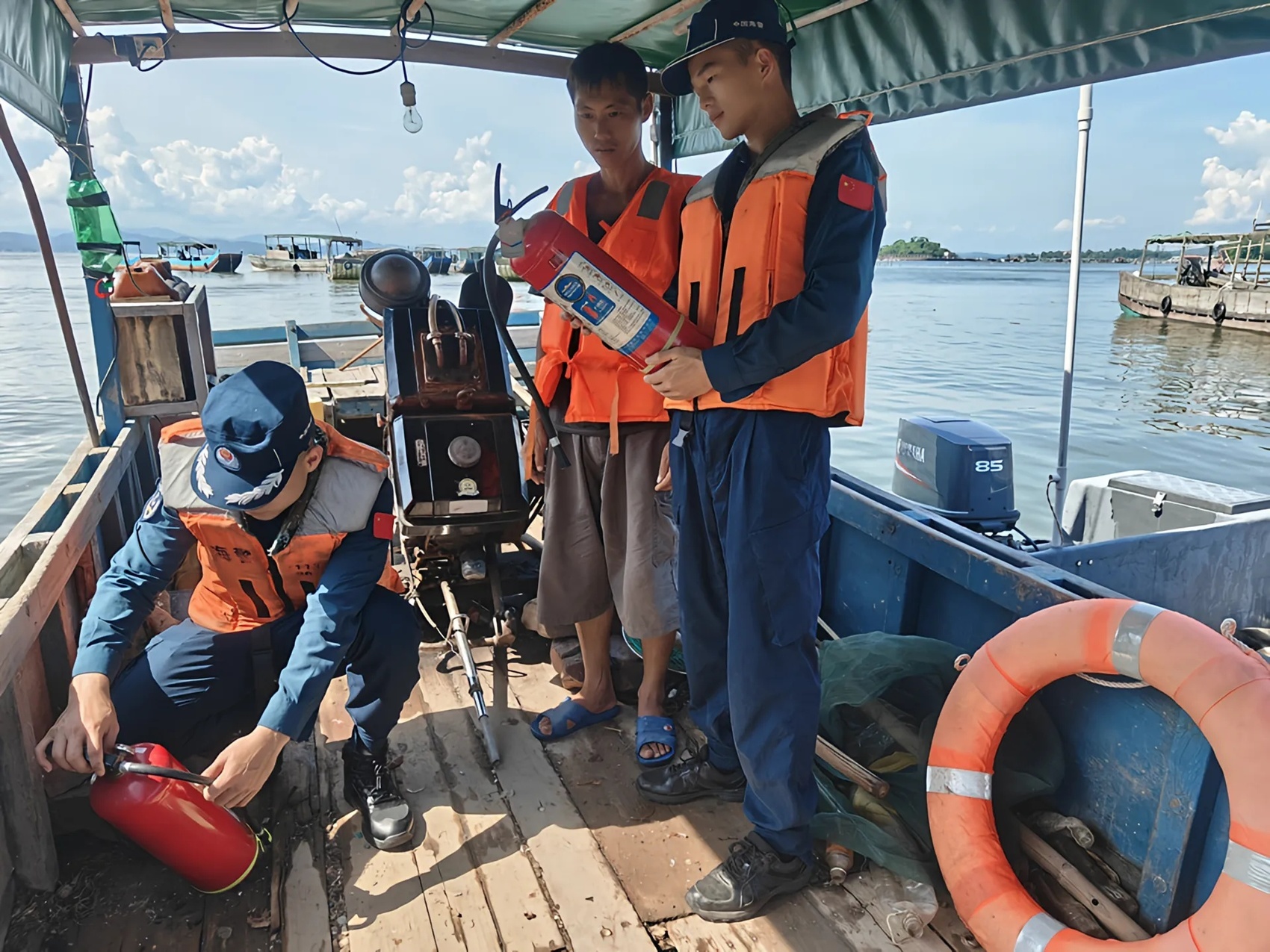 谯禾林(右一)与战友一起检查渔船消防设施。段奕伸 摄