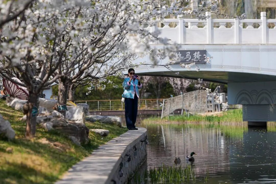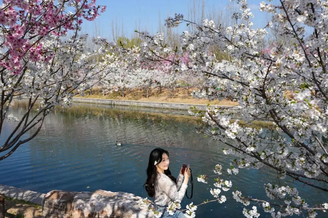 4月1日,在北京朝阳区亮马河国际风情水岸,一位游客在樱花盛开的河边赏花留影。