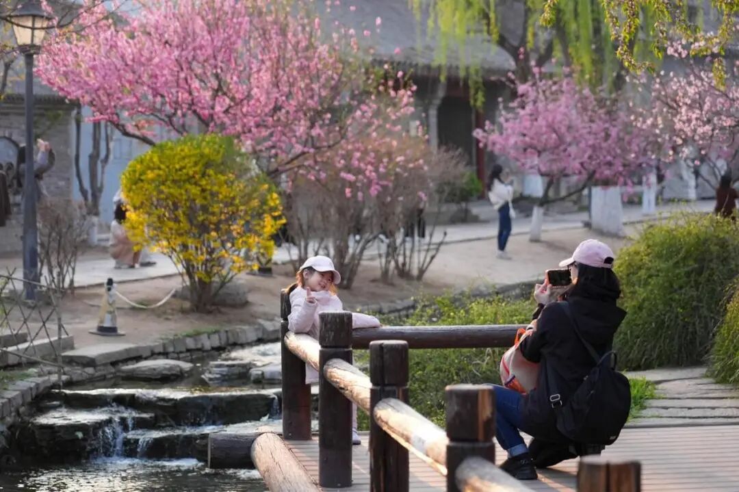 3月31日,市民游客在北京三里河公园赏花游玩。
