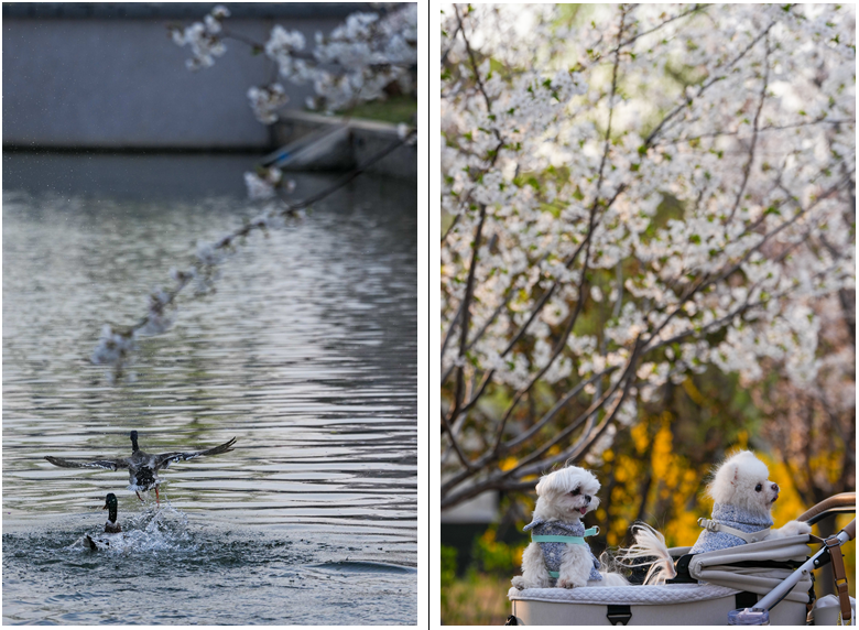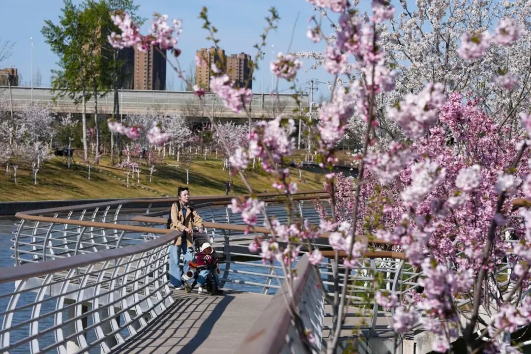 4月1日,在北京市坝河岸边,一位行人推着小朋友赏花游玩。