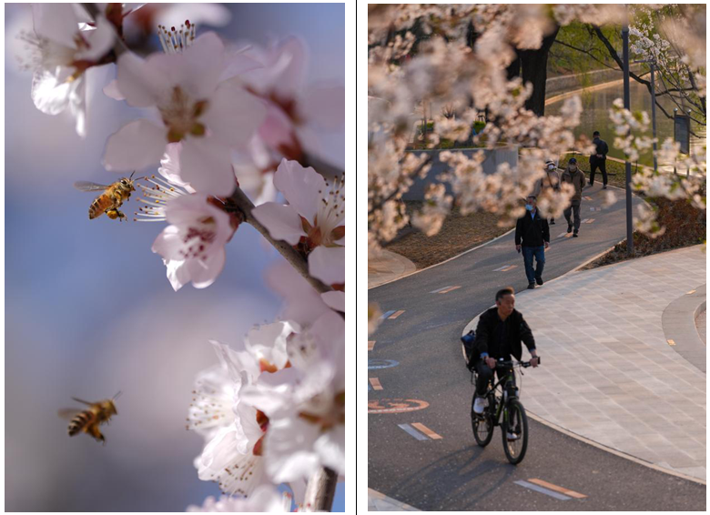 4月1日,游客在鲜花盛开的北京市坝河岸边骑行。