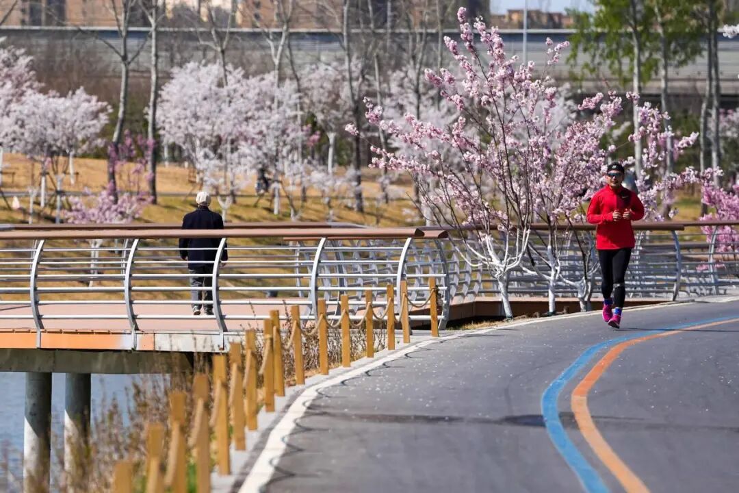 4月1日,市民在鲜花盛开的北京市坝河岸边跑步锻炼。