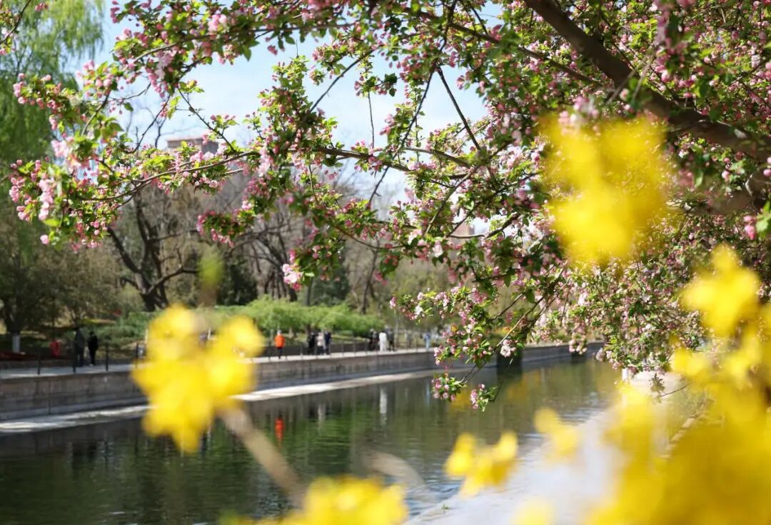 4月1日在北京元大都城垣遗址公园,岸边海棠花含苞待放即将迎来盛开。
