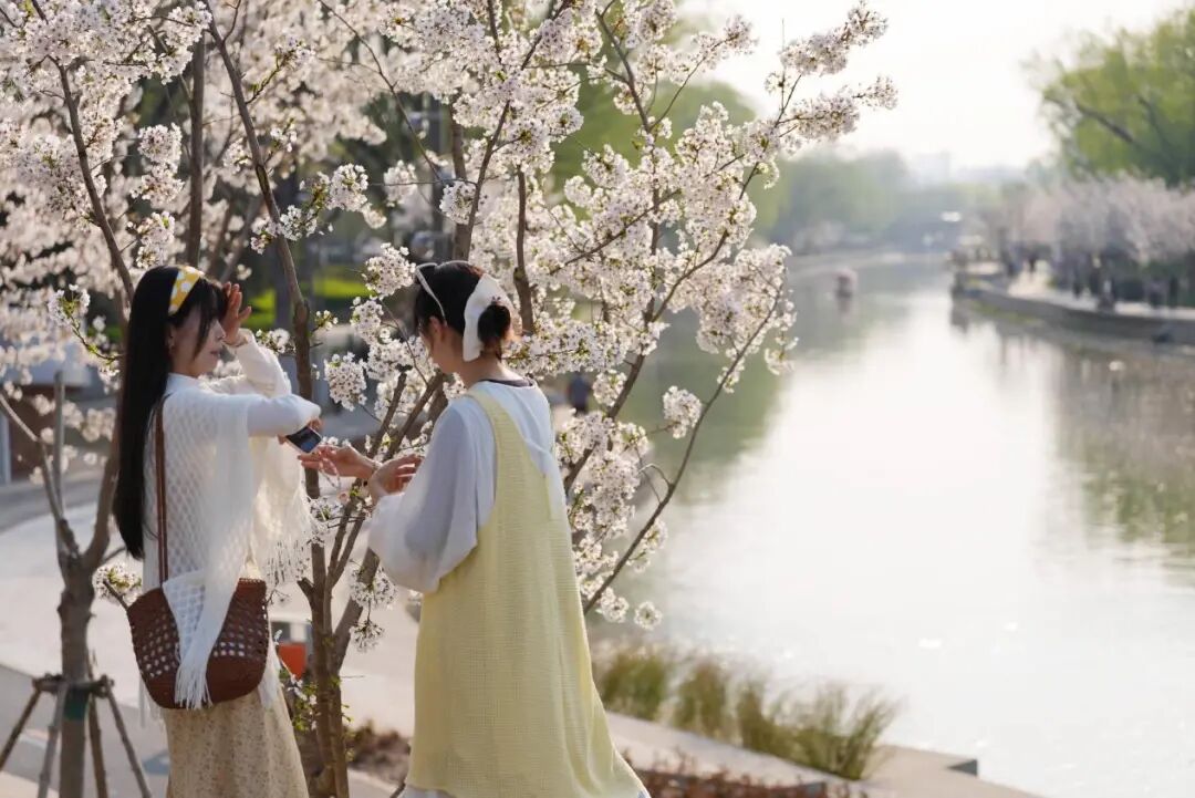 4月1日,在北京朝阳区亮马河国际风情水岸,几位游客在岸边欣赏盛开的樱花。