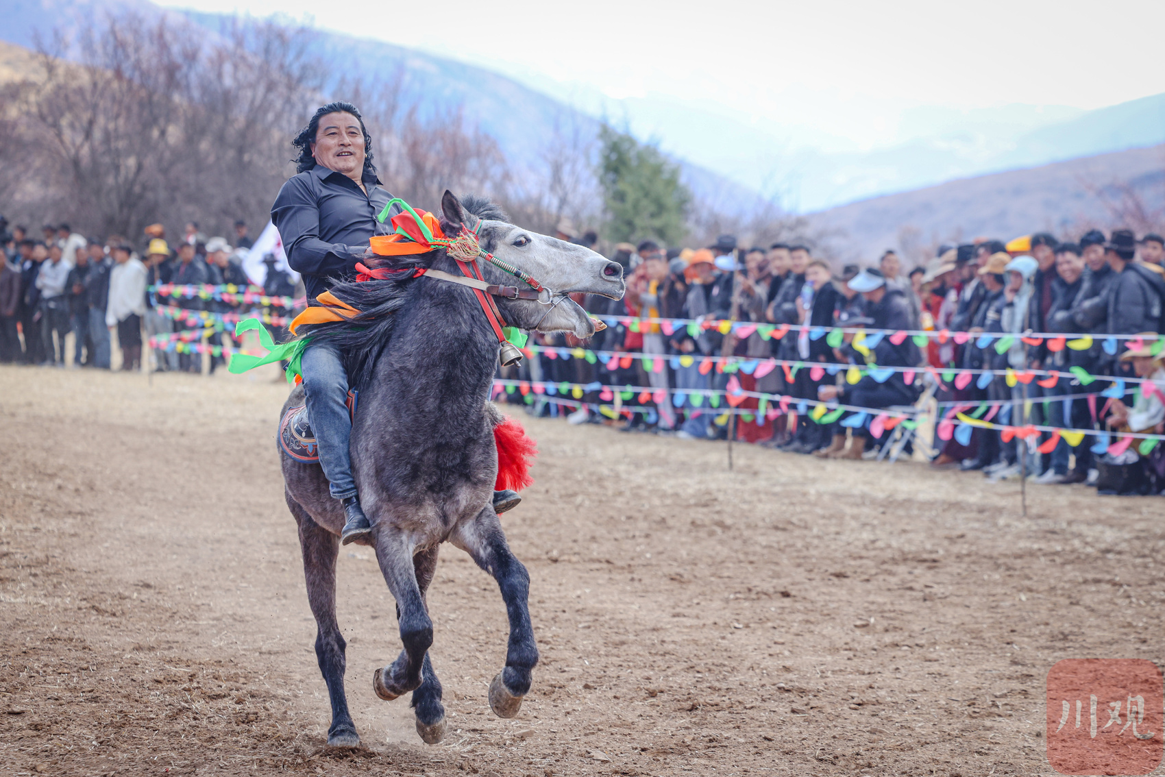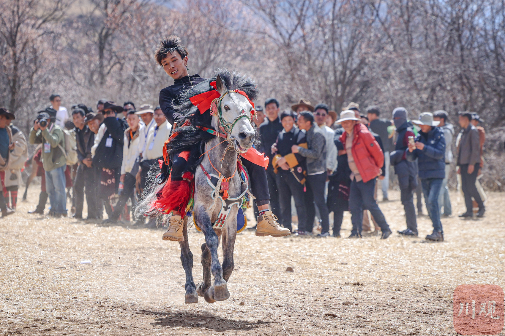 骑手们身着传统藏装,身姿挺拔、神采飞扬;骏马也佩上精致古董马鞍与华丽鞍垫,盛装以待。随着活动正式开始,一匹匹骏马依次稳步驰骋而出。