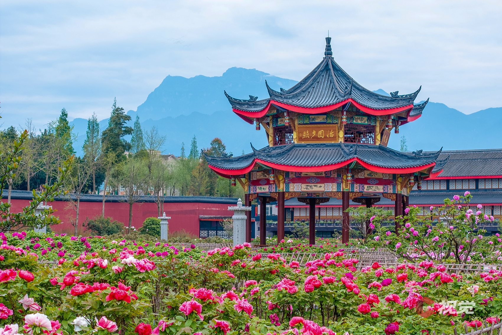 3月23日,峨眉山大佛禅院园林区怡园牡丹迎来盛花期,背后的峨眉山巍峨挺立。C视觉签约摄影师 刘睿