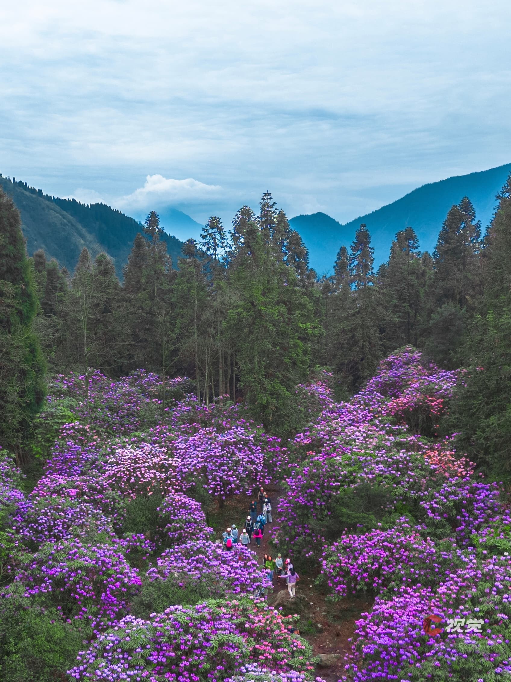 4月1日,成都都江堰龙池国家森林公园内万亩杜鹃花将群山装扮成一片斑斓的海洋。C视觉签约摄影师 李佳