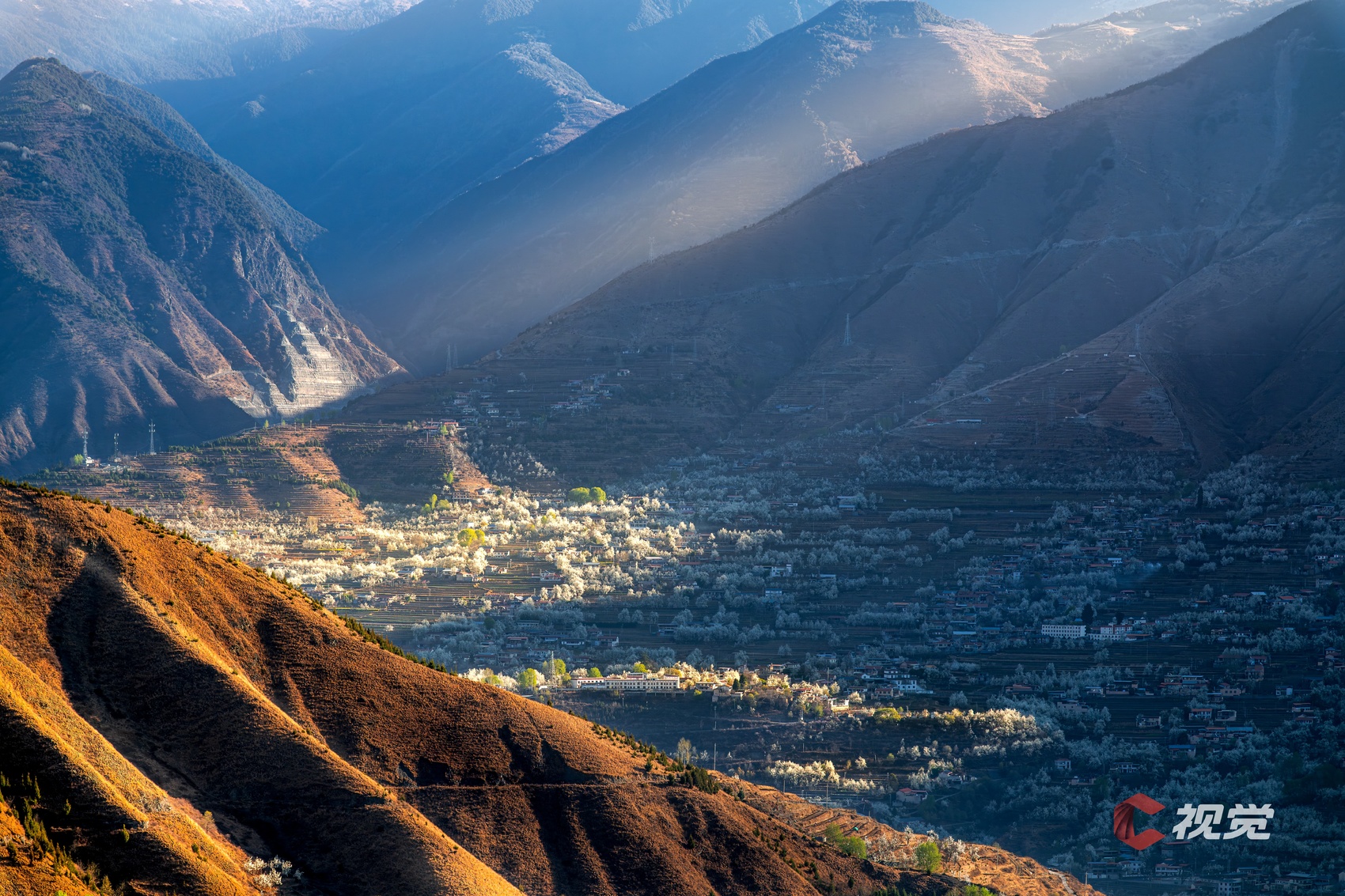 3月21日,阿坝金川县神仙包景区,晨光穿透山谷,洒在繁盛的梨花之上。C视觉签约摄影师 张梦