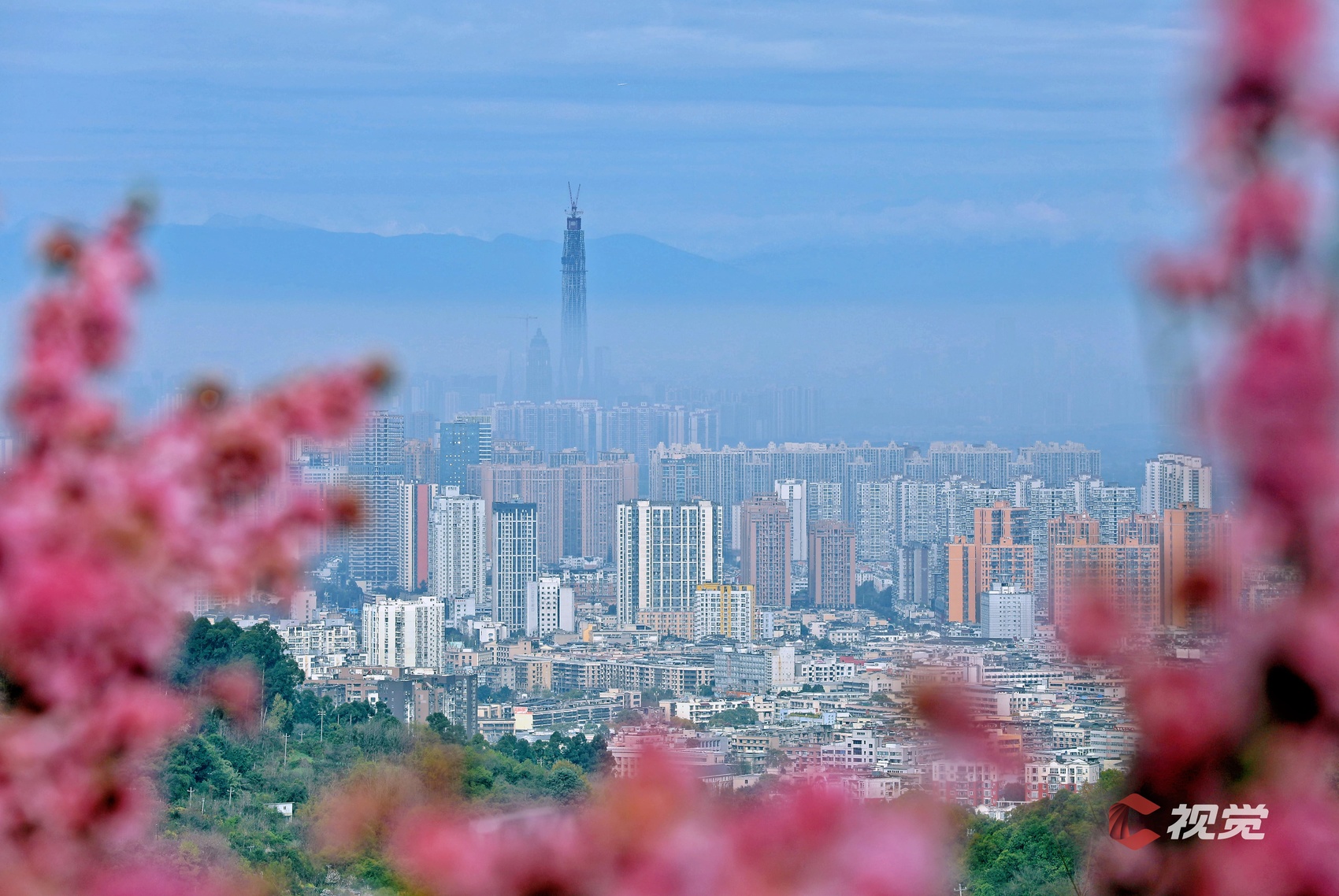 3月中旬,成都龙泉山城市森林公园满山遍野桃花绽放,与雪山对望,与城市同框。C视觉签约摄影师 王金城