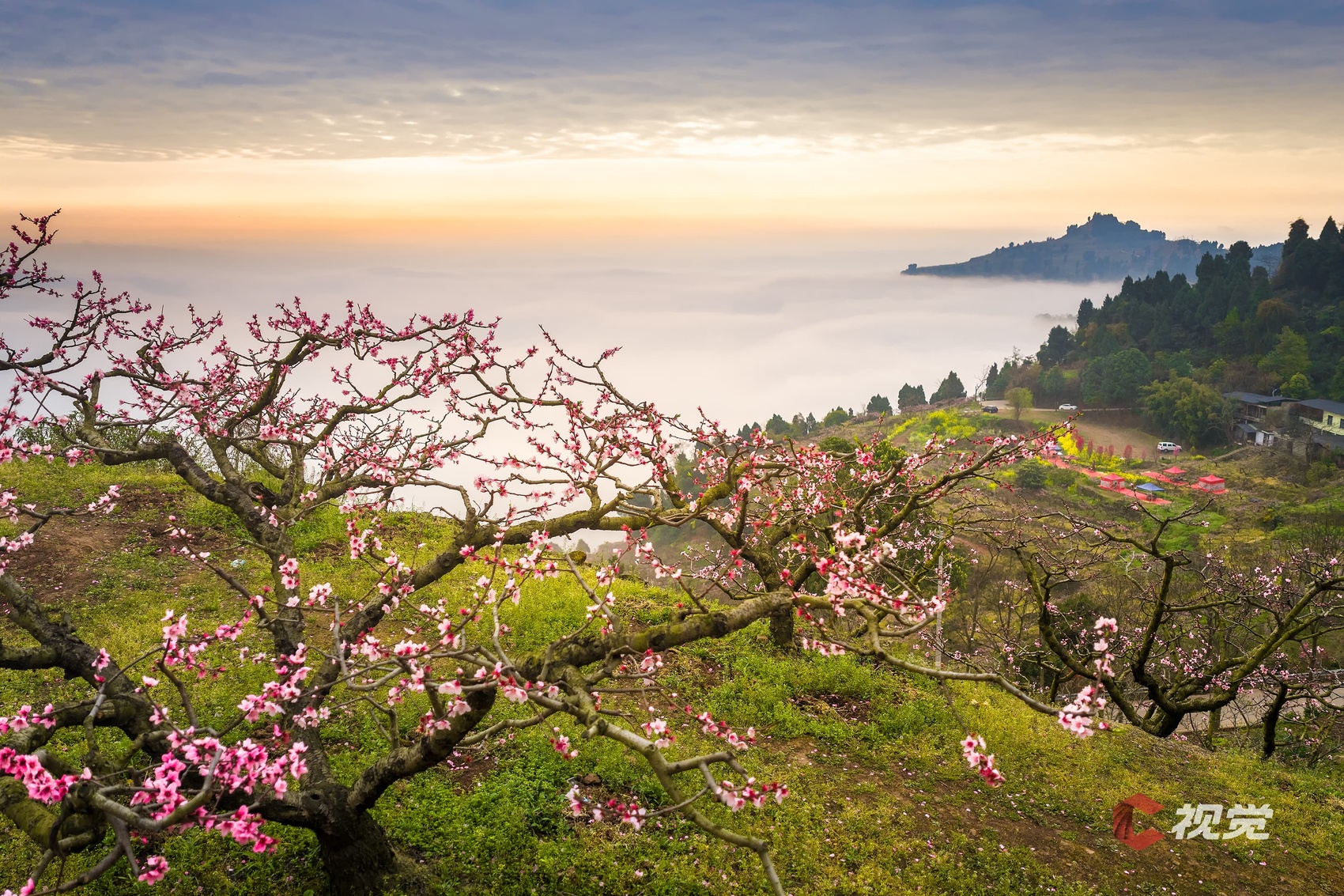 3月中旬,龙泉山云海翻涌,朝霞洒在桃花上。C视觉签约摄影师 沈军