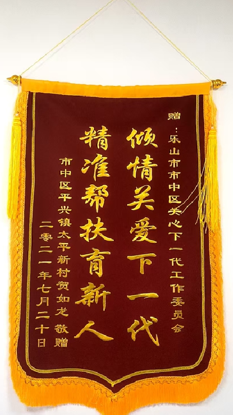 应伟华也提前转账 5000 元资助金,彻底解决了贺如龙的入学难题。 后顾之忧得以解决,贺如龙一家喜笑颜开。2021 年 7 月,贺如龙委托父亲向区关工委赠送 “倾情关爱下一代,精准帮扶育新人” 锦旗,表达深深谢意。应伟华所在的成都豪情商贸有限公司,因连续 12 年资助贺如龙等 3 名寒门学子,累计资助贺如龙 6 万元,两次被评为乐山市市中区 “关心下一代爱心企业”,区关工委还专程赴成都为企业颁发奖牌。