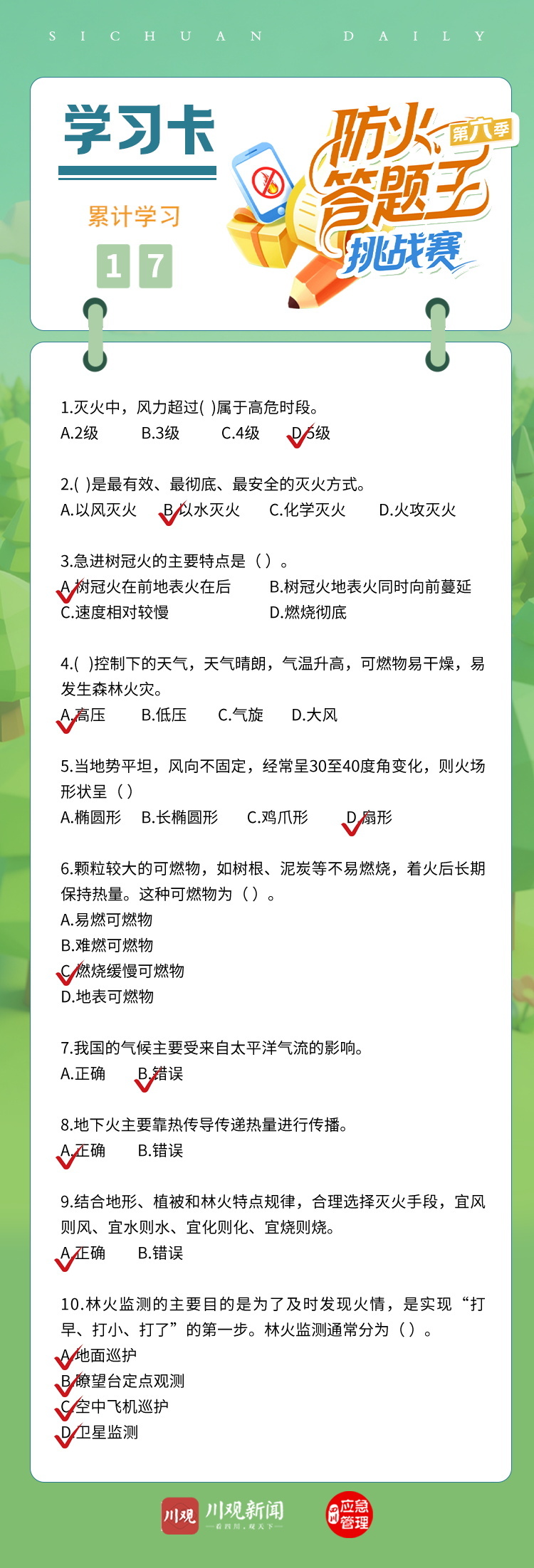 防火“答题王”第六季新一期学习卡来啦!风力几级属于灭火高危时段?什么是最有效、彻底、安全的灭火方式?急进树冠火有何特点?地下火依靠什么传递热量?这些护林防火的关键问题,答案都藏在这份学习卡里。通过这份学习卡查漏补缺,吃透相关知识,筑牢森林防火安全防线。快来打卡学习,解锁防火新知识,争当名副其实的防火 “答题王”!