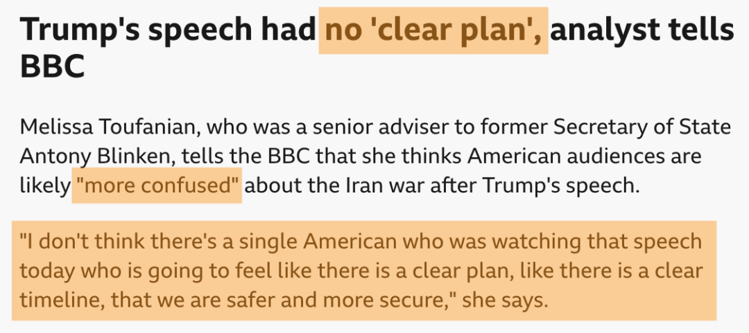 ——美国国务院前官员梅利莎·图法尼安:特朗普在讲话中没有提供关于战事的“明确计划或时间表”,美国人听完后可能会“更加困惑”,“没有人会觉得我们因此变得更安全、更有保障”。