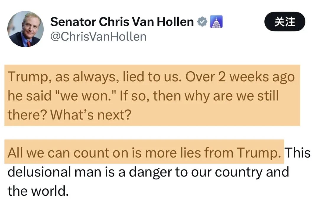 ——美国民主党籍参议员克里斯·范霍伦:“特朗普像往常一样对我们撒了谎。两周多前他就宣称‘赢了’,但我们为什么至今还陷在(中东)那里呢?接下来将发生什么?我们唯一能预计到的,也只有特朗普更多的谎言。”