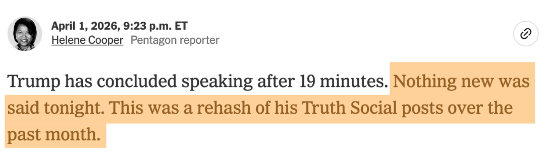 ——美国《纽约时报》记者海伦妮·库珀:特朗普的讲话内容“毫无新意”,“是他过去一个月社交媒体贴文的老调重弹”。