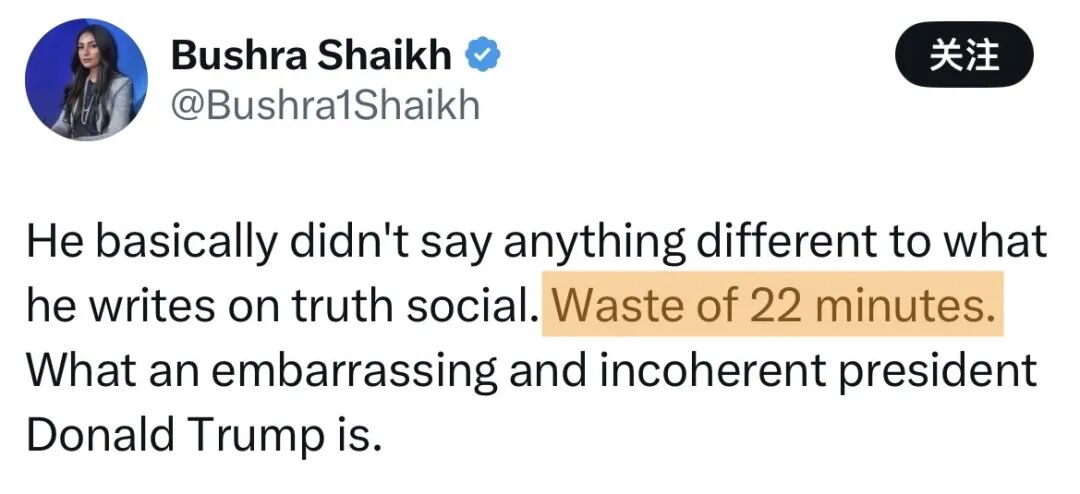 ——英国电视评论员布什拉·谢赫:这场讲话“白白浪费了我们22分钟”。