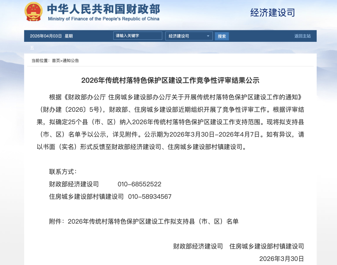根据《财政部办公厅 住房城乡建设部办公厅关于开展传统村落特色保护区建设工作的通知》,财政部、住房城乡建设部近期组织开展了竞争性评审工作。根据评审结果,拟确定25个县(市、区)纳入2026年传统村落特色保护区建设工作支持范围。近日,拟支持县(市、区)名单予以公示,公示期为2026年3月30日—2026年4月7日。