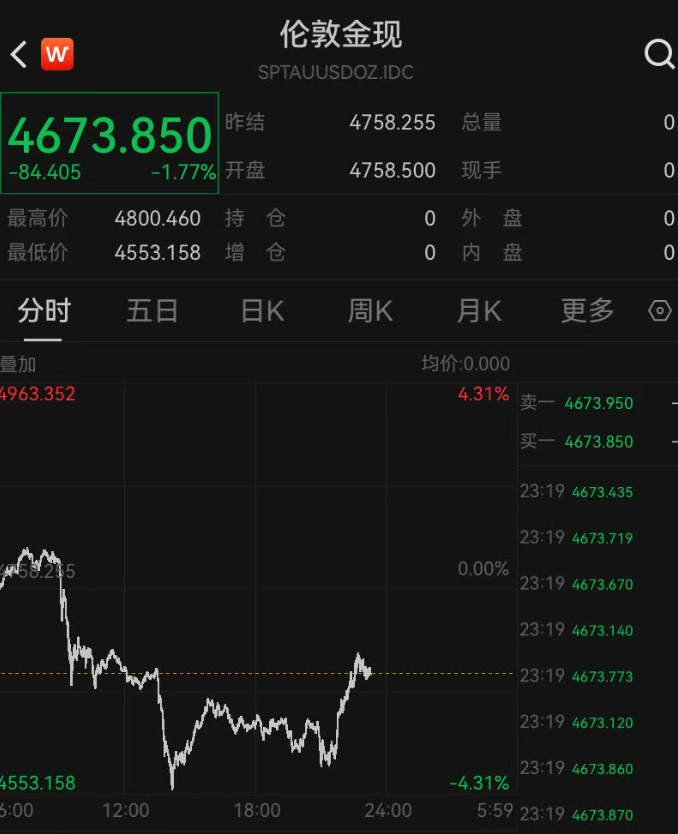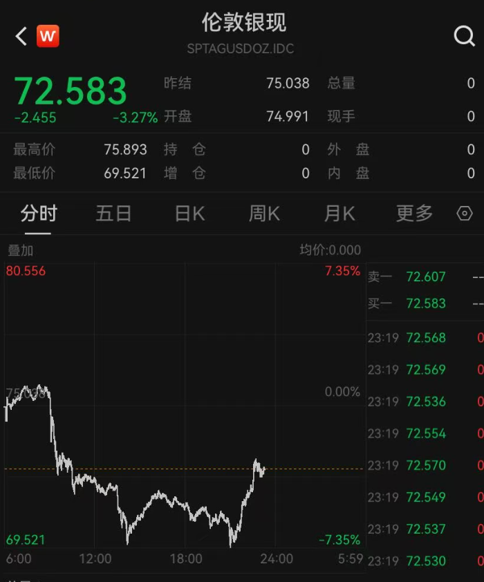 现货黄金一度跌超4%,目前跌幅已收窄至1.77%,报4678美元/盎司;现货白银一度大跌7%,目前跌幅收窄至3%,报72.58美元/盎司。