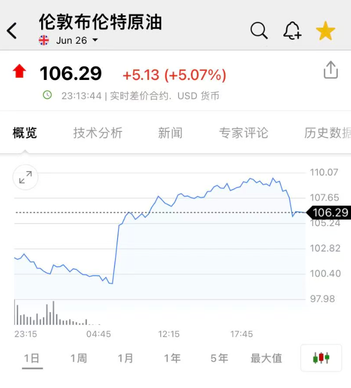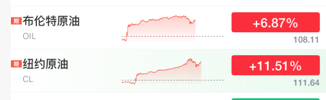 国际油价涨幅回落,美油(WTI原油期货)涨9%,报109美元/桶;布油涨5%,报106美元/桶。