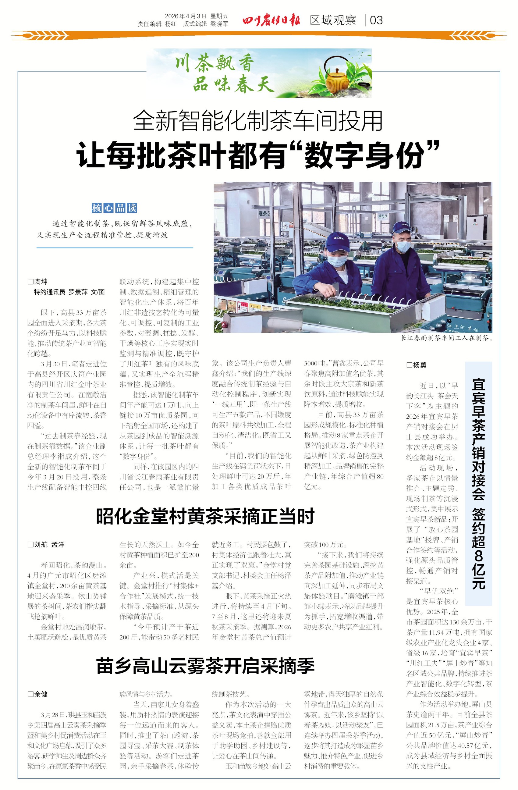 川茶飘香迎春天,智能制茶赋能产业升级。高县全新智能化制茶车间投用,实现茶叶生产全流程精准管控,让每批茶叶都有“数字身份”,既保留茶味底蕴又实现提质增效。