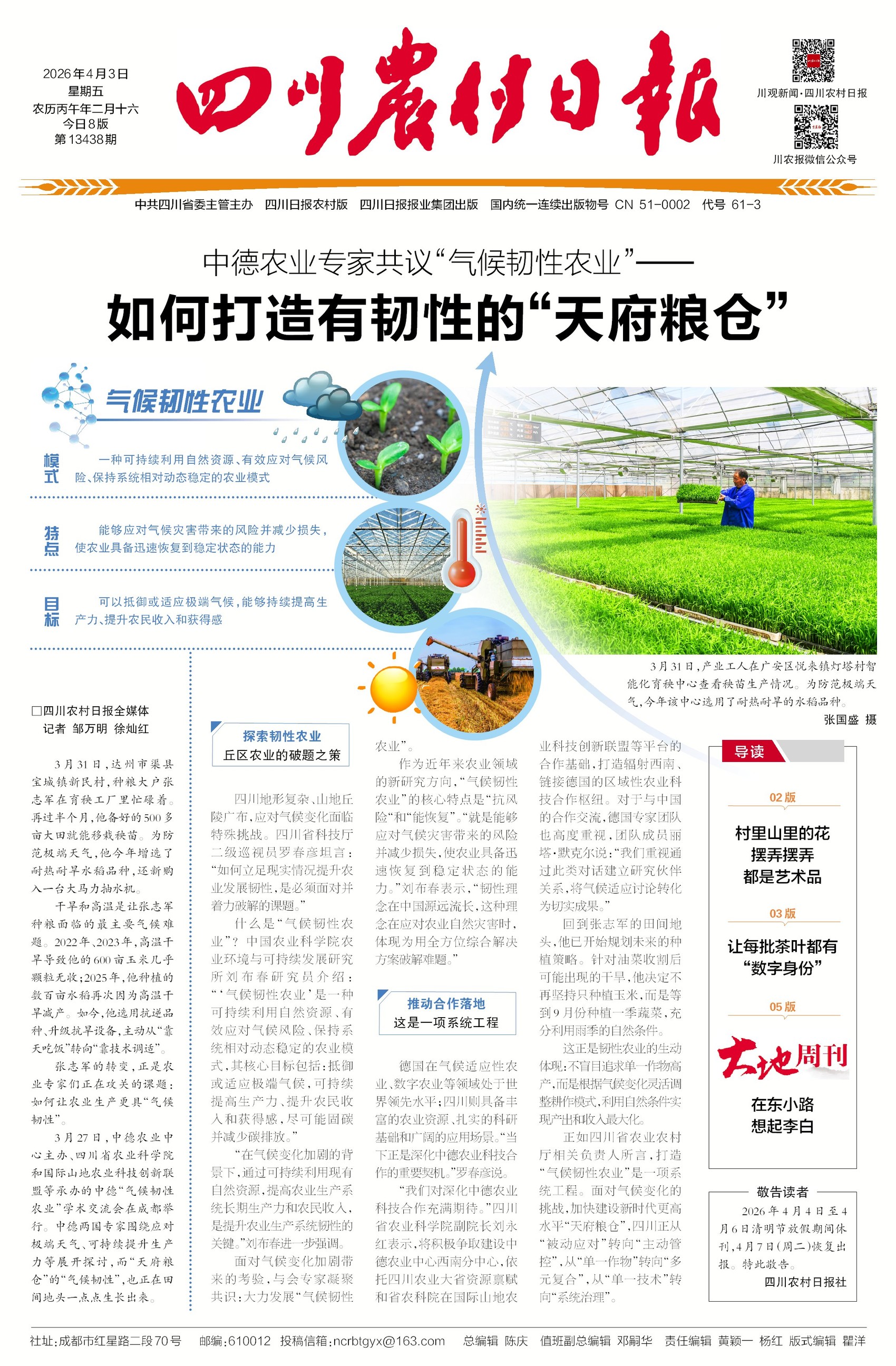 中德专家共议“气候韧性农业”,如何打造有韧性的“天府粮仓”。面对极端天气频发、旱涝急转等挑战,四川正以“气候韧性农业”为破题方向,通过选育耐旱水稻品种、完善设施农业等方式,提升农业抗风险和稳态恢复能力,筑牢粮食安全根基。